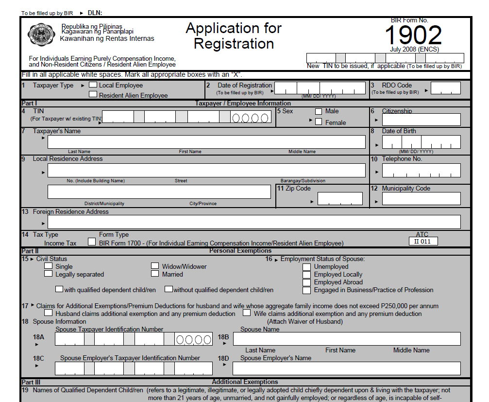 - BIR Form 1902 (download form here) – Fill out this application for registration for individuals earning purely compensation income and non-resident citizens/OFWs/Seafarers earning purely foreign-sourced income.